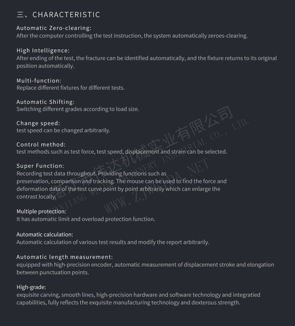 計(jì)算機(jī)控制拉力試驗(yàn)機(jī)采用豪華測試軟件界面可實(shí)現(xiàn)定速度、定位移等控制模式加上多階控制模式可滿足不同的測試要求。測試結(jié)束可自動(dòng)存檔、手動(dòng)存檔,測試完畢自動(dòng)求算最大力量、上、下屈服強(qiáng)度、抗拉強(qiáng)度、彎曲強(qiáng)度、100%定伸強(qiáng)度、300%定伸強(qiáng)度、彈性模量、延伸率、剝離區(qū)間最大值、最小值、平均值、等等。